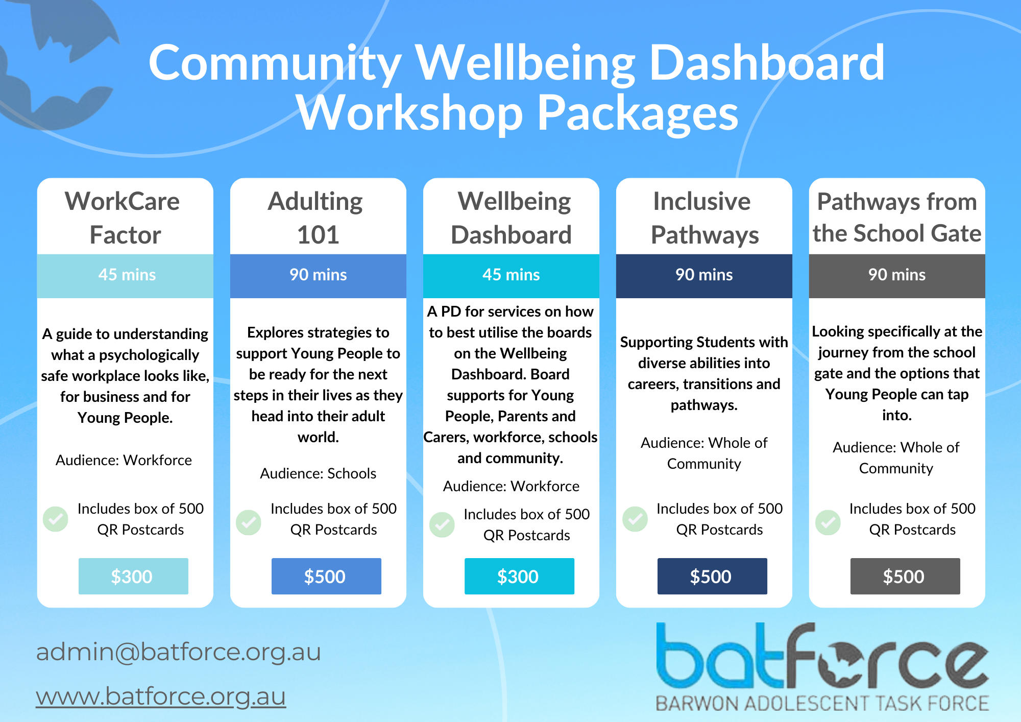 Our workshops cover a wide variety of audiences, from Students (from Year 3-12), Families (pre-school, primary, secondary and transitioning into adulthood), Schools, Workforce and Community. All workshops listed below are available for each cohort.