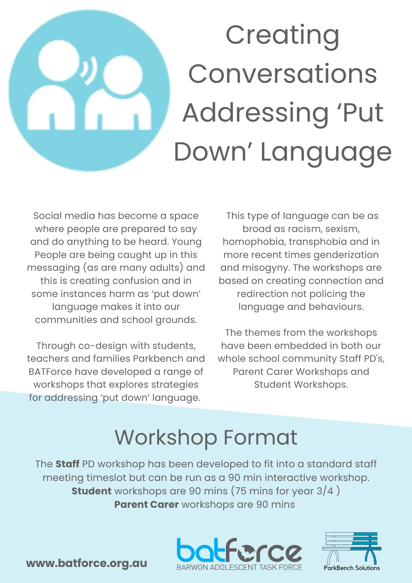 The Creating Conversations Addressing ‘Put Down’ Language workshops explores the online world where people are prepared to say and do anything to be heard. Young People are being caught up in this messaging (as are many adults) and this is creating confusion and in some instances harm as ‘put down’ language makes it into our communities and school grounds.